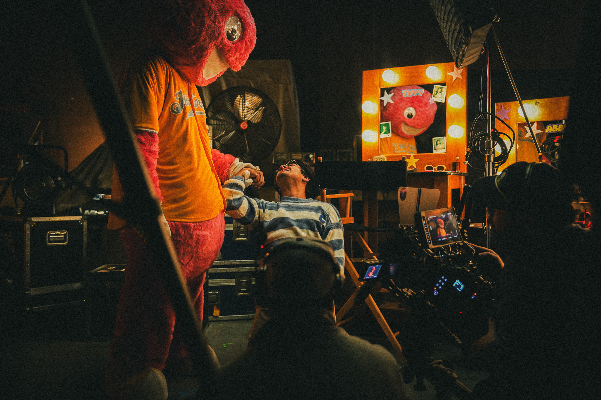 In Tiffy's playhouse we have a character, Mister Mascot which is a 7FT tall pink fuzzy Mascot. Dealing with the suit of that character, and how big and tedious it is to work with definitely made shooting sometimes difficult. The character does quite a few stunts in the film and doing that safely and visually appealing took more shooting time than we had hoped. The camera would have to go really low, or really high to match close ups with other actors.